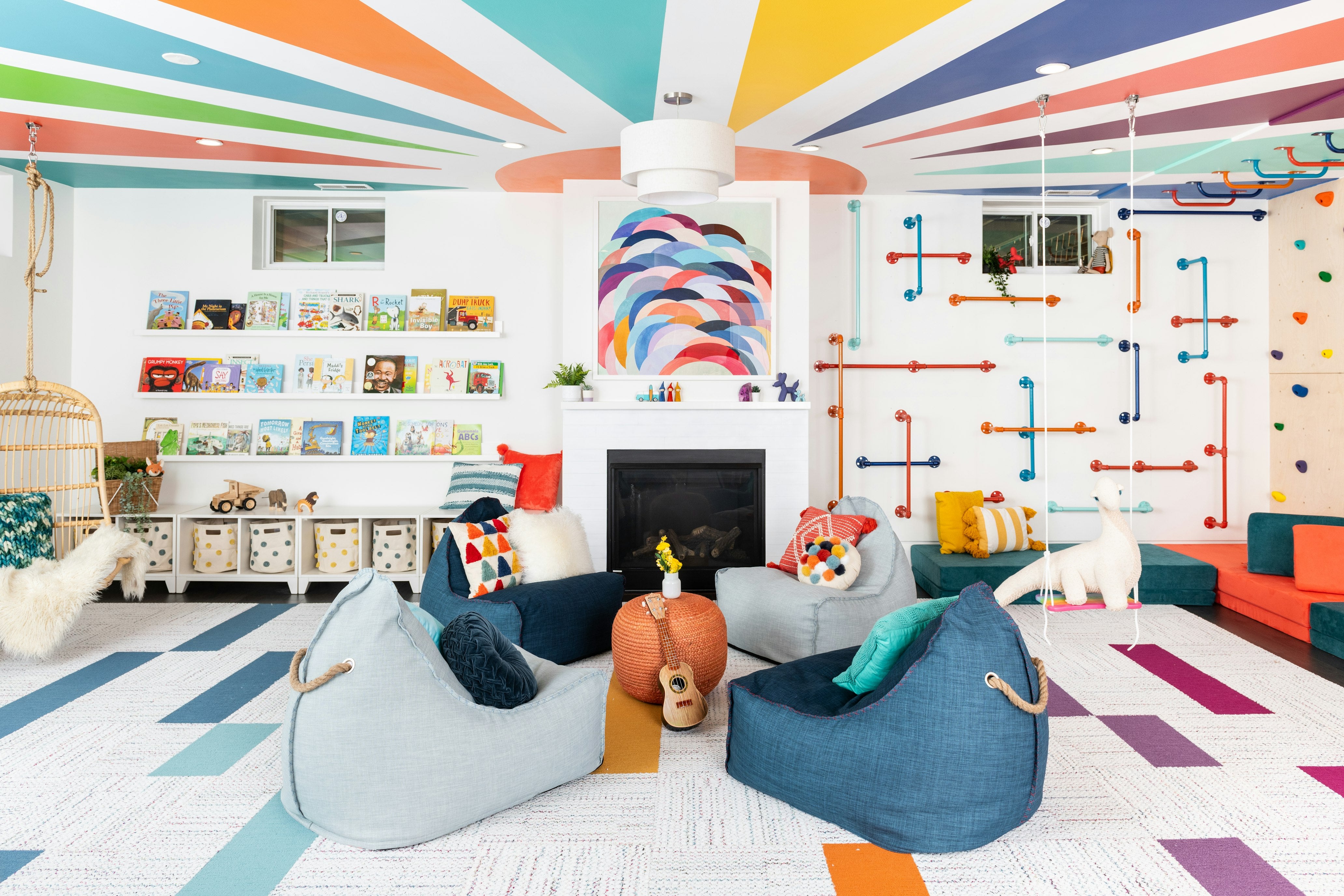 Founded by two teachers, grOH! is on a mission to bring play back home. To facilitate play in the best way, Anne and Jodie at groH! focus on encouraging large motor skills. Swings, ladders, rope hammocks, and rock climbing holds all appear in their playroom designs.