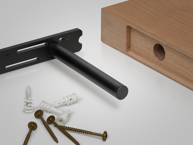 Available in 15 lengths and built to support shelves up to 14 inches deep, Aksel delivers serious holding power — each round rod is rated for up to 90 lbs. A powder-coated finish adds durability and a clean, pro look. Slotted mounting holes make stud alignment easy, while all the options flex to fit shelves of nearly any length.